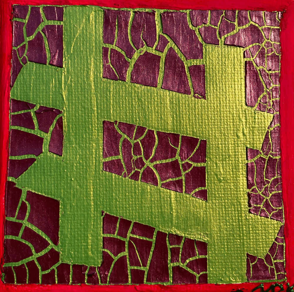 Im Zentrum des Werks steht eine leuchtend gelbgrüne Raute – oder ein Hashtag-Zeichen. Die reduzierte, fast grafische Form scheint zu schweben, umgeben von einem Hintergrund in flieder-lila Crackle-Struktur. Durch die aufbrechende Oberfläche entsteht eine organische Tiefe, ein subtiles Spiel zwischen Kontrolle und Loslassen.